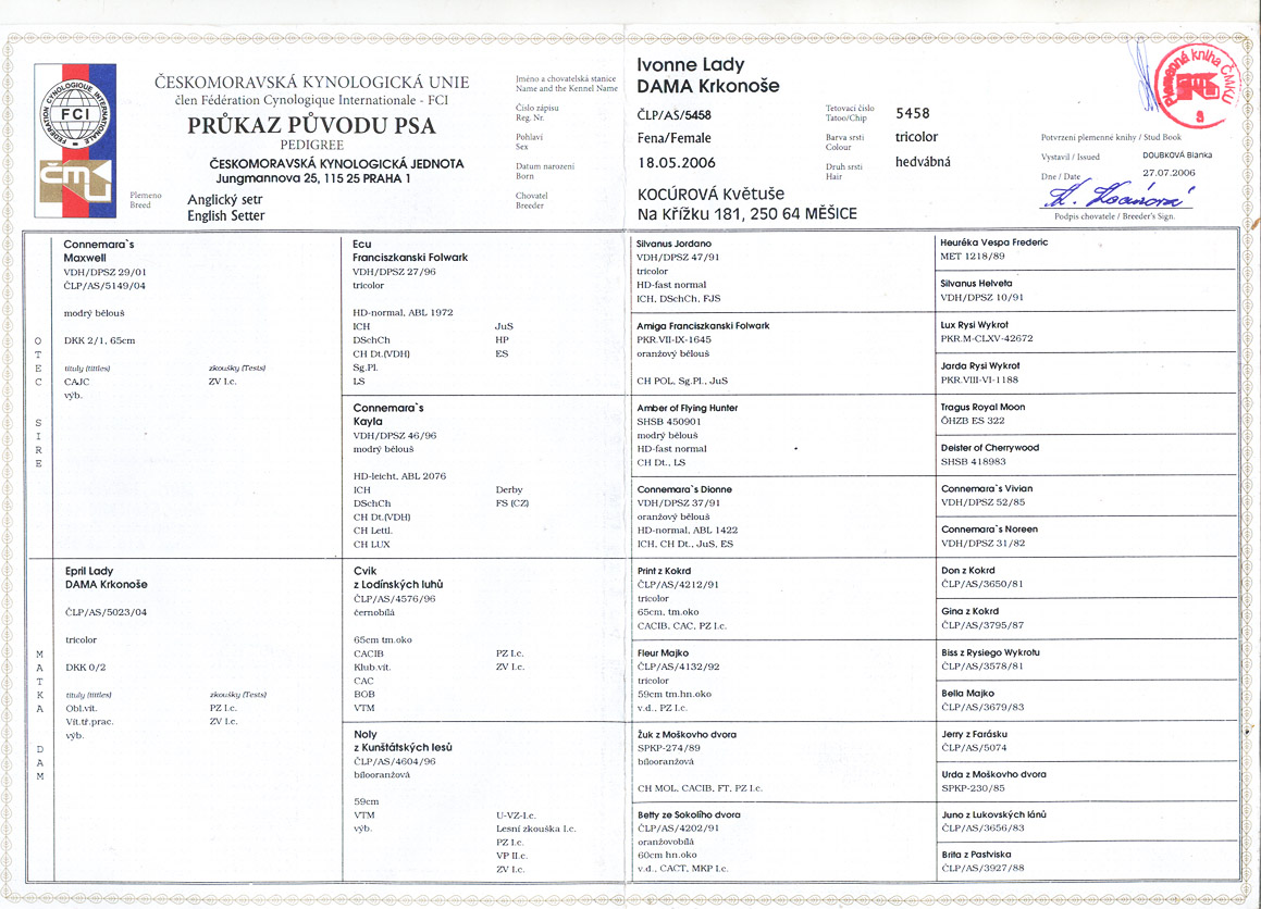Ivonne je fena anglického setra barvy tricolor (černá, bílá a hnědá), která má přednosti především po stránce pracovní, kde díky své snadné cvičitelnosti dosáhla na základních zkouškách vloh titulu CACT - čekatelství národního šampionátu práce. Na výstavním poli se jí podařilo získat titul druhá nejlepší fena plemene - res. CACIB. Má velice klidnou povahu a je dokonalým společníkem pro svého pána.